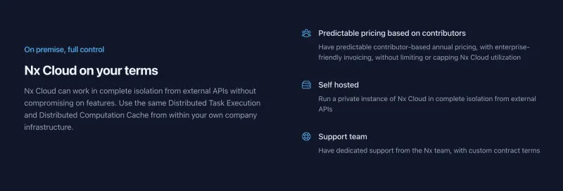 We have extensive experience working with Fortune 500 companies, helping them scale their development using monorepos. This has given us valuable insight into the unique security requirements of these companies. Our Enterprise plan reflects that allowing organizations to have a fully self-contained version of Nx Cloud that can be hosted on their own servers and comes with dedicated support from the Nx and Nx Cloud core team.