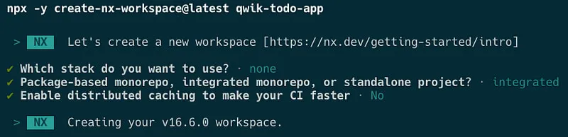 Let’s start by setting up our development environment. We’ll create an Nx workspace and integrate Qwik into it. Begin by generating an empty integrated workspace: