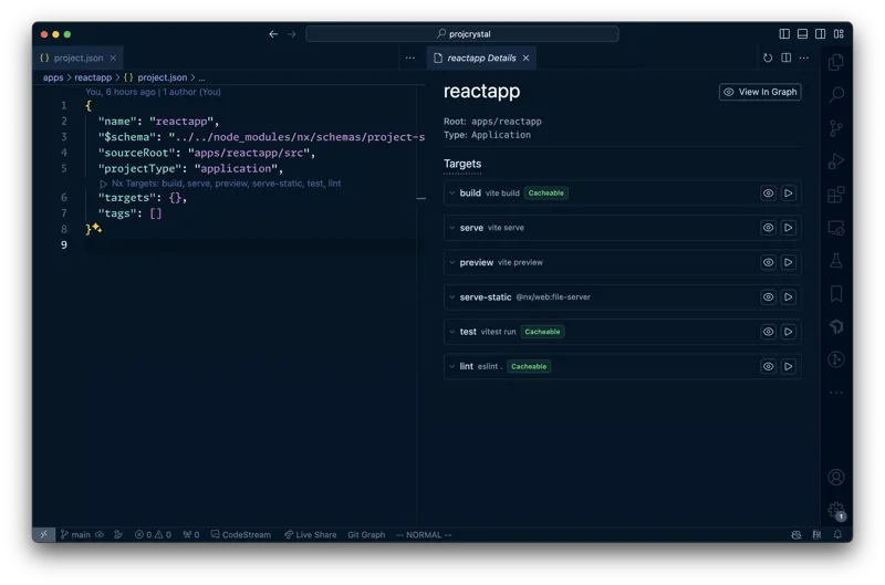 ... and you choose an “integrated monorepo” you’ll get the usual setup powered by Nx Plugins and all the features and benefits that come with them. Where you’ll see Project Crystal in action is when you open a project.json file, which will most likely look like the following: